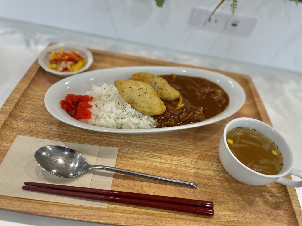 『白身フライのカレーライス』 副菜とスープ付き(税込み¥750) 当店特製のカレーライスにさっくりした白身魚のフライをトッピングしました。 トマト入りのカレーで味わい深くもあり、さっぱりとした後味です…