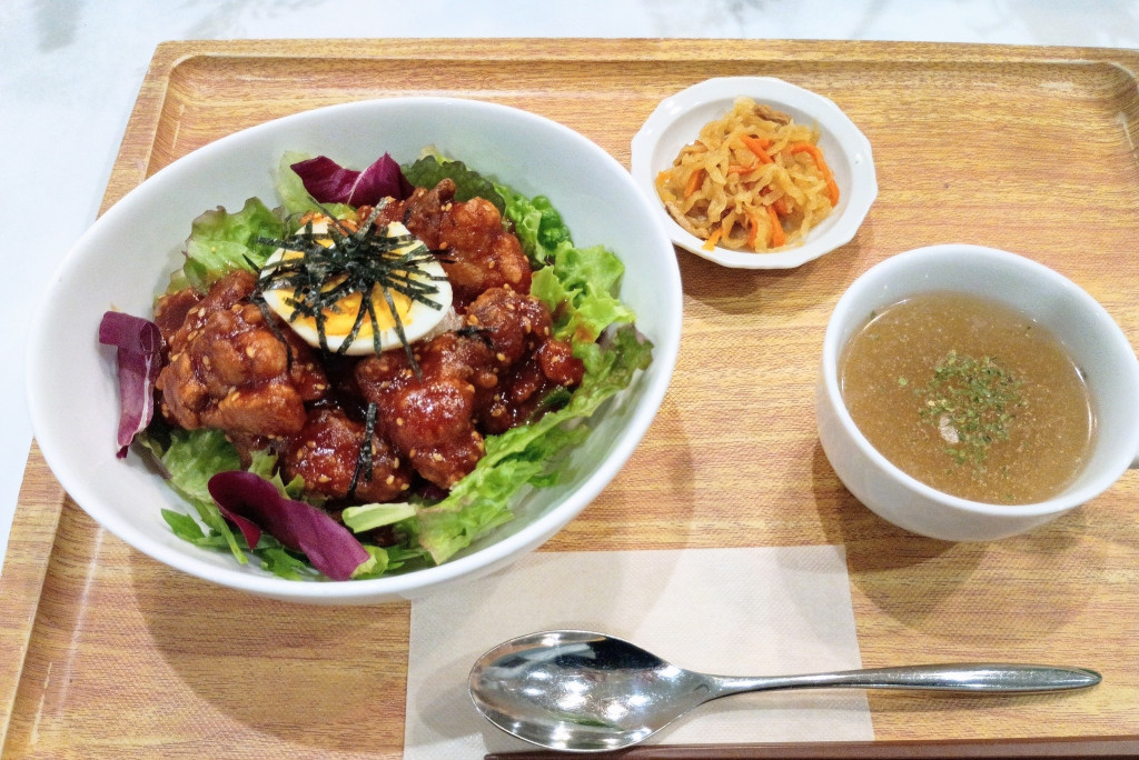 『ヤンニョム風チキン丼』 副菜とスープ付き (税込¥750) 韓国料理で人気のヤンニョムチキンをアレンジしました! コチュジャン入りのソースを絡めた揚げ鶏は甘辛く、ごまの風味の香ばしさも。 とろけ…
