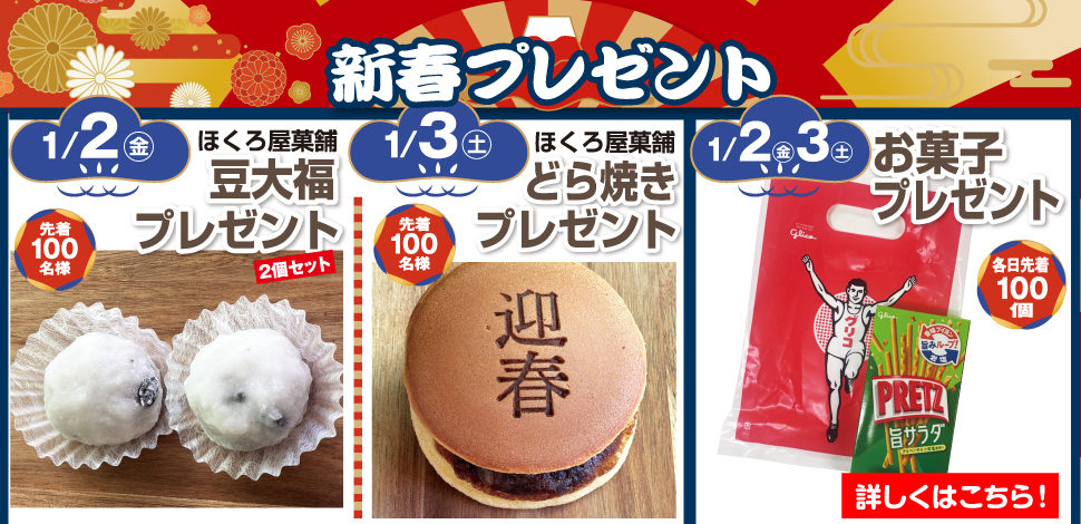 2026年の招福を祈願して 【新春ふるまい】 老舗和菓子店の豆大福、どらやきを無料プレゼントいたします。 開催日時:1月2日(金)ほくろ屋菓舗 豆大福、1月3日(土)ほくろ屋菓舗 どらやき 10:00~10…