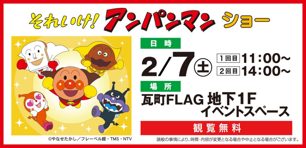 2月7日(土)は それいけ!アンパンマン ショー を開催! ぜひ親子で瓦町FLAGへお越しください。 開催日時:2月7日(土)1回目11時~2回目14時~ 開催場所:B1Fイベントスペース(最寄りの出入…